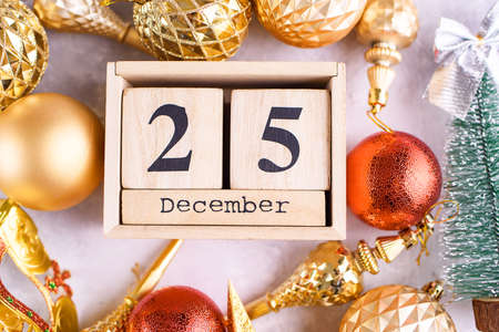 New Years content, Christmas tree gold toys, a small Christmas tree, lights, wood eco cubes with the figure on December 25. Merry Christmas