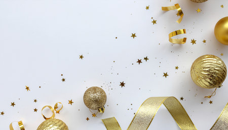 A festive arrangement of golden Christmas baubles, ribbons, and star-shaped confetti on a clean white surface, perfect for holiday themes.
