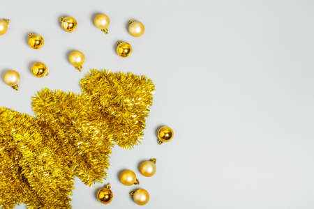 Golden Christmas tree made from tinsel and golden Christmas balls on a gray background. New Year or Christmas concept. copy space, minimalism