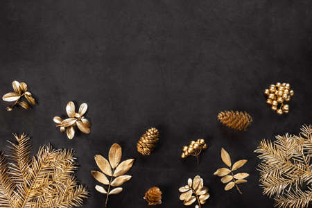 New Year's flat lay in golden and black shades. Spruce branches, leaves, cones and berries are painted with golden paint. Stylish concept of christmas, celebration. Top view, minimalism, copy space.