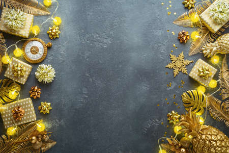 Christmas holiday creative background with gift box, creative golden decorations, pineapple and palm leaves. Greeting card or banner design