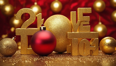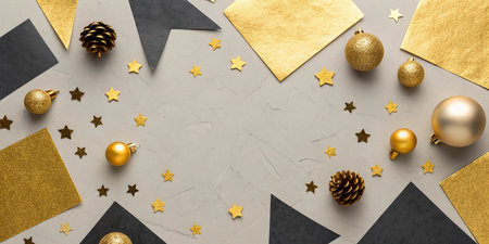 This vibrant image showcases an array of festive golden decorations, shimmering confetti, and elegant ornaments, perfect for holiday celebrations and joyful gatherings.