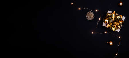Winter banner. White gift with golden bow, gold balls and sparkling lights garland in xmas decoration on dark background for greeting card. Flat lay, top view, copy space