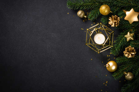 Black christmas background with fir tree and holiday decorations.