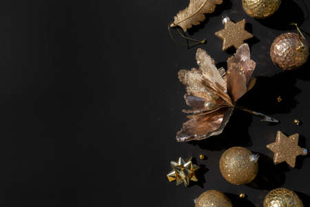 Christmas minimalistic and simple composition in mat black and gold color. Christmas decor, gold decorations on black background. Flat lay, top view with copy space. Autumn winter background.