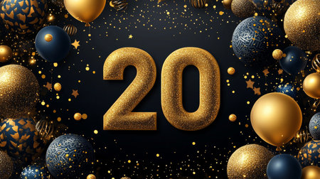 Celebrate in style with this stunning photo of golden '20' balloons and glittery decorations perfect for milestone events! Glam up your special occasion. Stylish Celebration. GoldenVibes. Generated A.I.