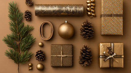 A festive arrangement of golden Christmas ornaments, gift boxes, pinecones, and ribbons on a clean white surface, evoking holiday cheer.