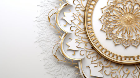 Floral showing close up of ornate golden arabesque pattern with intricate floral and geometric details on a white background keywords: ornate, golden, arabesque,...