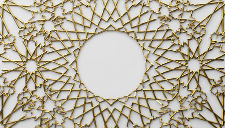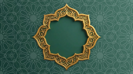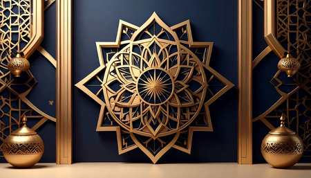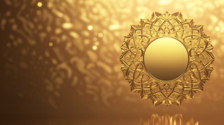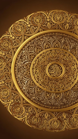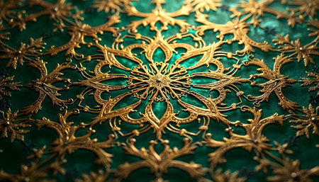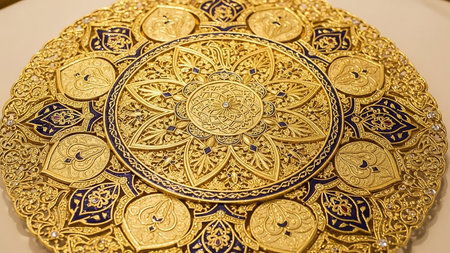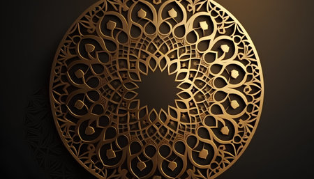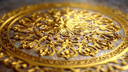 This photo showcases a close-up view of a gold plate adorned with crosses, emphasizing the intricate details and craftsmanship, Intricate details of an Islamic geometric pattern, AI Generated