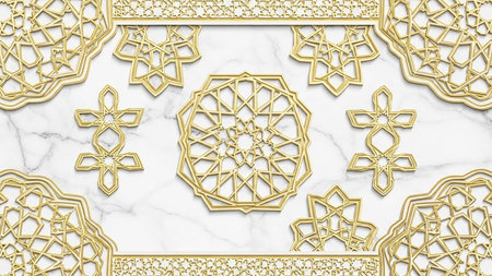 Golden intricate geometric Islamic patterns and ornaments arranged on a white marble textured background.