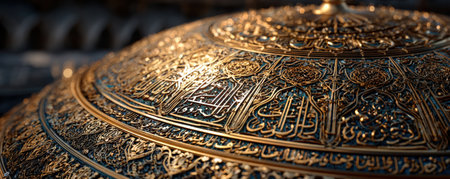 Detailed dome features exquisite geometric patterns and calligraphy, beautifully illuminated, highlighting craftsmanship and textures, creating a tranquil ambiance
