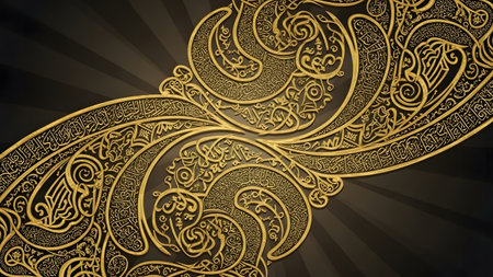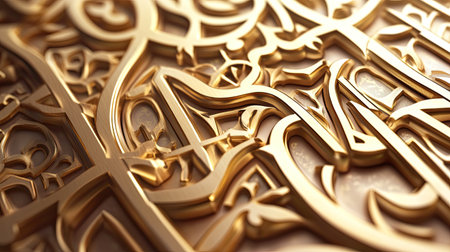 Close-up view of ornate golden calligraphy on a textured surface, emphasizing intricate designs and craftsmanship, reflecting cultural heritage and artistic expression