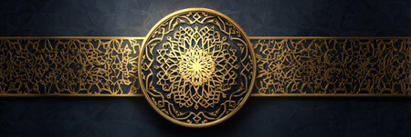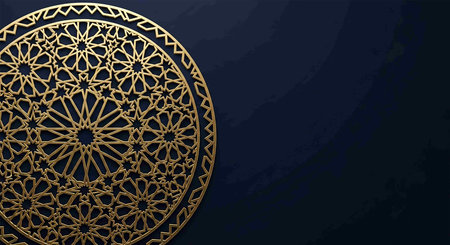 Background design illustration based on traditional oriental graphic motifs. Islamic decorative pattern with golden artistic texture. Arabian ethnic mosaic with interlacing lines and geometric tiled ornaments.