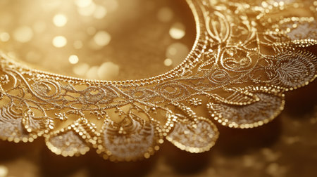 This detailed close-up image showcases an intricate gold lace pattern with a shimmering bokeh background, perfect for fashion and artisan craft projects.