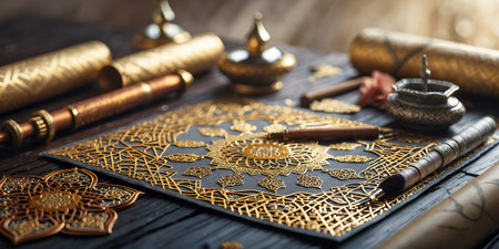 Intricate gold calligraphy and crafts on a wooden table during a cozy evening gathering