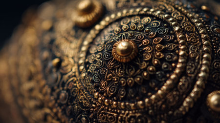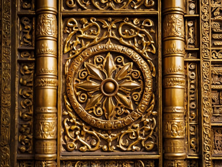 Close-up of an ornate metallic surface with intricate engravings and patterns, highlighting the craftsmanship and artistic details in a rich texture and design