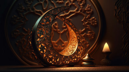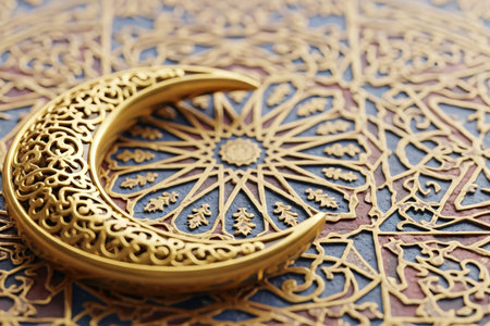Golden crescent moon resting on an ornate Turkish patterned surface, with geometric arabesque and floral motifs, perfect for Eid decorations.