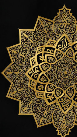 Stock showing elaborate golden mandala pattern with intricate circular on a black textured background. resolution use.