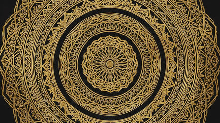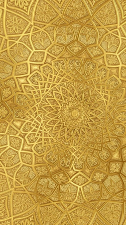 An ornate golden pattern repeating geometric and floral motifs in a symmetrical mandala with a textured metallic finish.