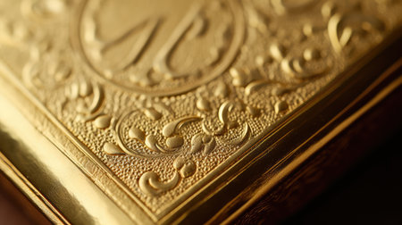Close-up of an intricately engraved gold surface showcasing detailed patterns and floral designs, reflecting traditional craftsmanship and artistic beauty.