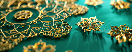 This image features an intricate and ornate design with a central golden pattern surrounded by flowing fabric in shades of green, blue, and red. The central motif is composed of symmetrical, interwoven lines and shapes, characteristic of traditional Islamic art. The fabric appears to be draped elegantly around the central design, with subtle sparkles adding a touch of glamour. The overall composition suggests a celebration or festive theme, possibly related to cultural or religious festivities.