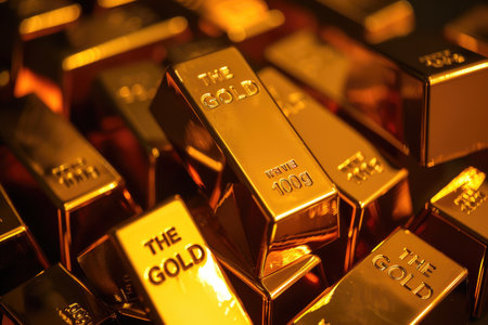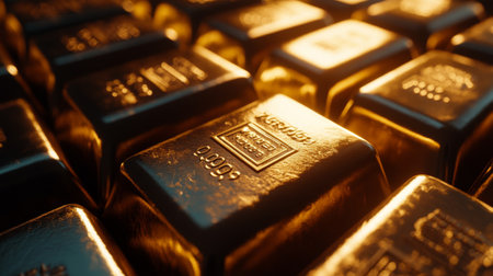 A dynamic image of multiple gold bars stacked neatly, with one bar slightly tilted to reveal its detailed engraving, creating an eye-catching display of wealth.