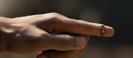Close up of a man's hand holding a gold ring in his finger