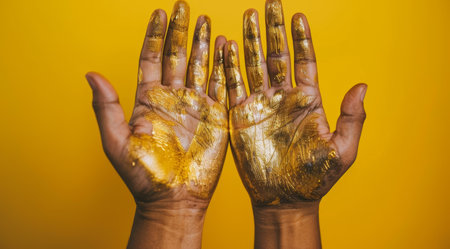 Golden Painted Hands on Yellow Background