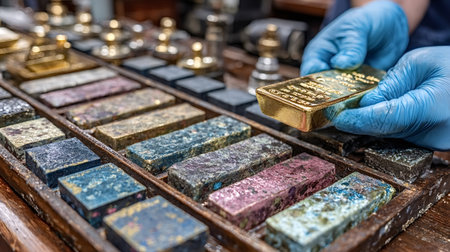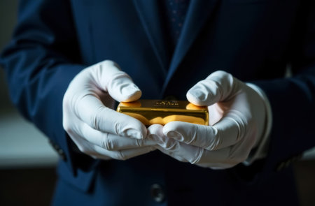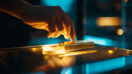 A hand carefully placing a gold bar into a transparent display case, with soft lighting accentuating its brilliance.