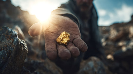 Dirty prospector's hand extending a gleaming gold nugget, symbolizing the excitement of discovery, the pursuit of wealth, and the hard work of mining under a bright sun flare