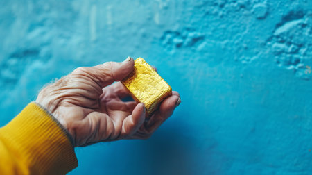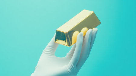 A hand in a protective glove holds a shiny gold bar against a soft blue background, symbolizing wealth, luxury, and investment opportunities in finance.