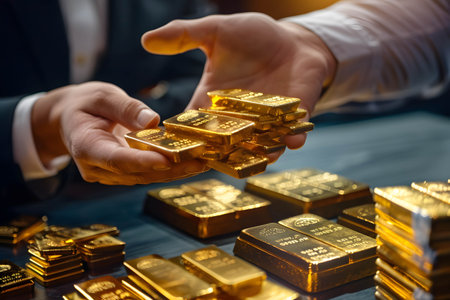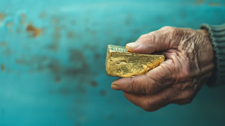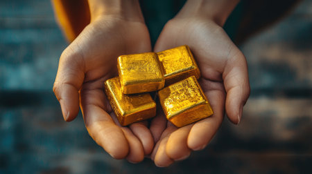 A captivating image featuring hands holding four gold bars, representing wealth and prosperity. The shimmering gold contrasts beautifully against a natural backdrop.