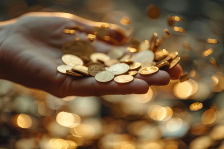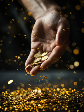 Gold coins falling from the hand on a dark background with bokeh