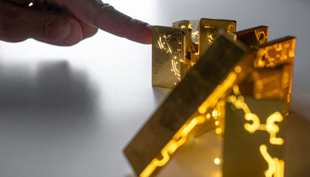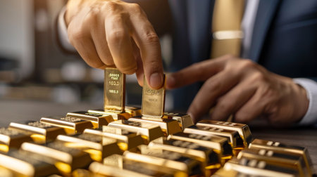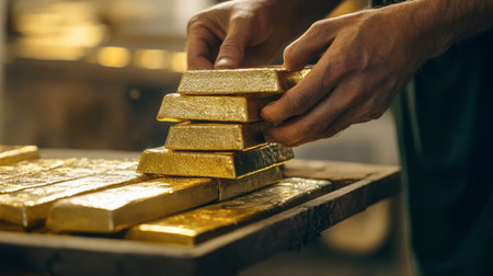 A hand carefully stacking gold bars on top of each other, with a focus on the craftsmanship and detail.