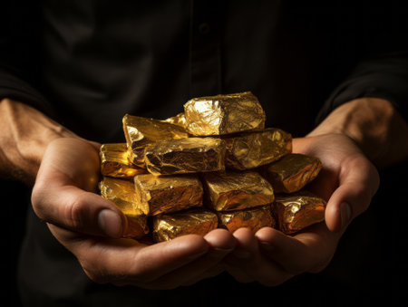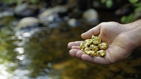 A stunning close-up of raw, golden nuggets in a miners hands, catching the light and gleaming with riches