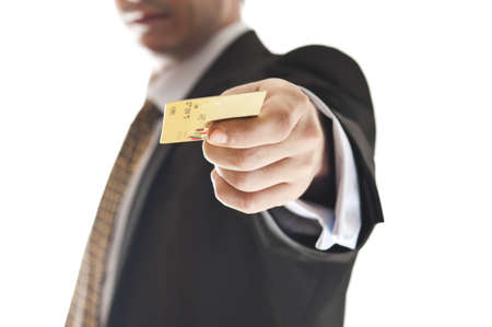Man's golden hand holding an empty business card over white background