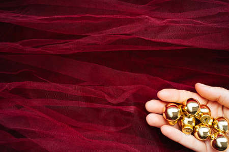 small gold ball ornaments in female hand lying on bordo red tulle layers. Christmas holiday season decoration