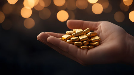 Gold nuggets in hand on dark background with bokeh effect