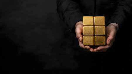 Businessman holding golden cubes in his hands on dark background with copy space