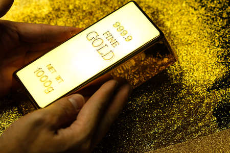 Gold bar in hand of man on a gold glittering background, The concept of gold is precious.