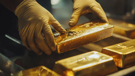 A close-up of a gold bar being carefully handled by a professional with gloves, emphasizing its value and care.