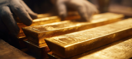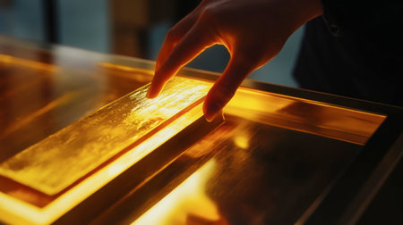 Close-up image of engraved gold bars with a gloved hand creating a subtle motion blur. The scene is illuminated with luxurious warm tones, highlighting the texture and details.