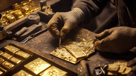 A goldsmith working diligently in a workshop, with gold bars and tools around, emphasizing craftsmanship and the creation of valuable items.