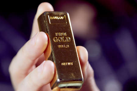 Hand holding 96.5 percent gold bar, isolated on white background