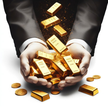 Gold bars falling on the hands of businessmen
