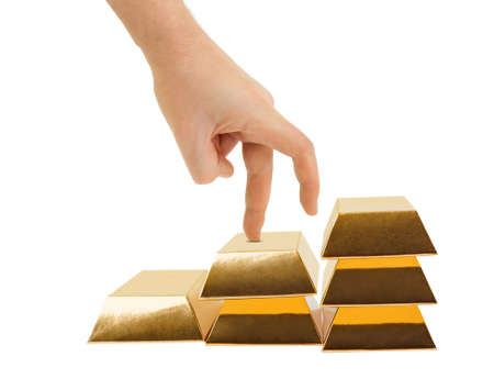 Hand and stairs made of gold bars isolated on white background