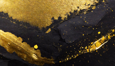 Fluid Art. Golden metallic particles and black waves. Marble effect background or texture