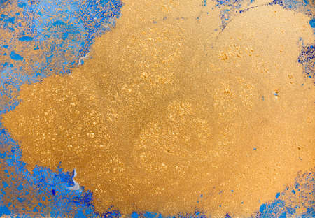 Piles of gold sequins on blue smudges of paint. Abstract pattern.