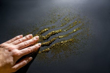 Abstract Sprinkle glitter gold dust on black background textured ,elegant and luxury concept