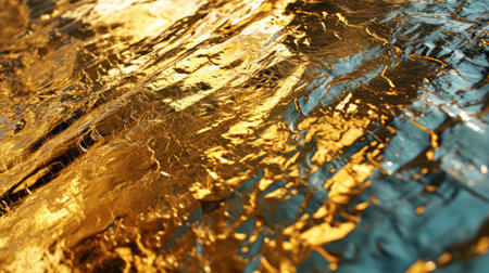 Golden and bronze foil texture with a glossy, metallic finish, creating a sleek, modern backdrop. Crinkled, grungy surface with shimmering effects, perfect for wealth or luxury decor.